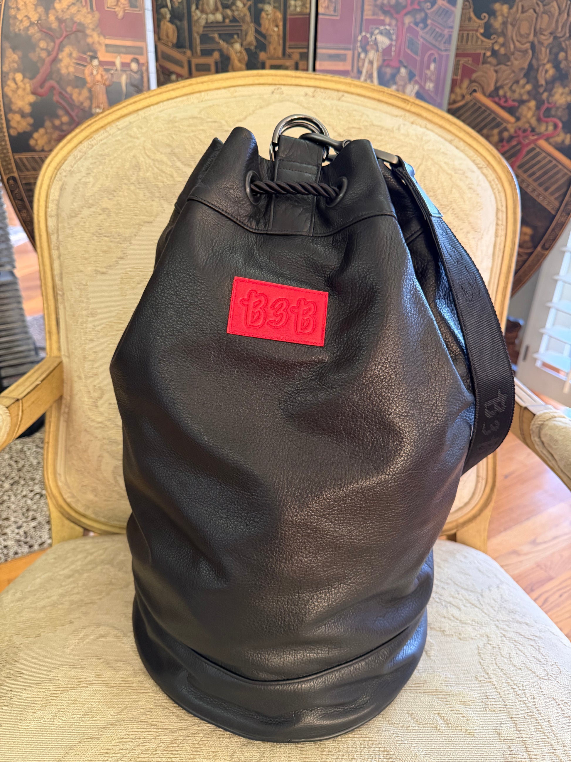 Leather Bag with drawcord closure adjustable leather with logo webbing strap. Metal hardware and metal feet on the bottom. Outside zip pocket for easy access for keys, phone or wallet. 100% cotton lining w / Large inside leather pocket.